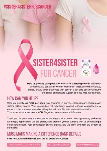 With just as little as R250 per pack, you can help us provide essential care packs to our sisters battling cancer. Your contribution not only brings comfort to those in need but also earns you the immense reward of aiding the sick, a noble act cherished in our faith.