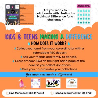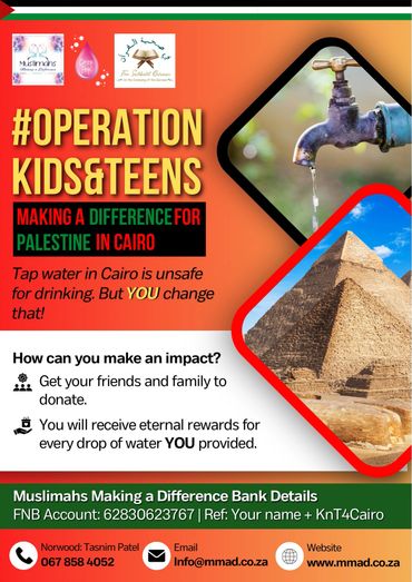 Assalaamu Alaykum Wa Rahmatullahi wa Barakaatu. Alhumdullilah, MUSLIMAHS MAKING A DIFFERENCE started this water project in 2012 for those who don't have access to clean drinking water. This project will be an ongoing project to provide clean & safe bottled water to families in need. A project borne from an exceptional NPO MUSLIMAHS MAKING A DIFFERENCE. MMAD has been focusing on women education, empowerment and development for years. Alhumdullilah, we now launch: #littlechangemakers #Kids&teensmakingadifference. This project provides students in South Africa and Cairo with clean water. Water is an essential part of our daily lives. We can make this possible for everyone by donating generously and benefiting humanity. By engaging children and teens in voluntary work. This act of kindness benefits humanity. Children and teens will have exposure to uplifting those around them and the community at large. All you need to do is advocate for this project by purchasing a card and getting a few people involved to collect funds and earn Thawaab. Allah has unlimited treasures to give us! This is a way for us to give back to the community. Water is the best way to do this! Rewards will be continuous even if it's just a few drops of water given.